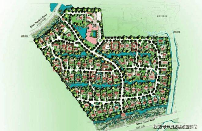 并且整个项目的设计师由一条景观主轴串联,中间在用环形布局,将每一幢别墅分布其中,胆大心细的让户户都临河,将资源天赋疯狂的展示到极致。