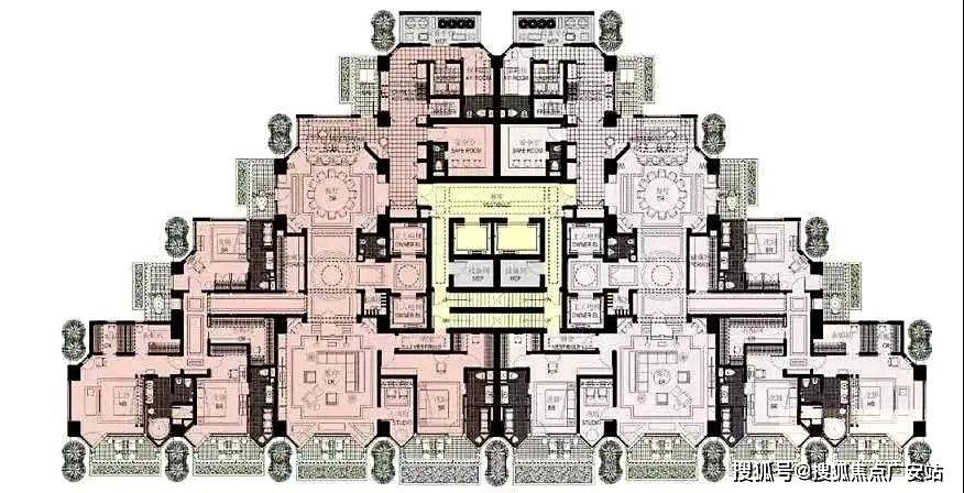 建筑外立面与外滩华尔道夫系出同门,充满未来主义又自带超级网红IP的现代Artdeco风格。底层架空打造了水景大堂,南侧塔楼顶部设计了一座停机坪,这是上海首个也是目前唯一设计顶楼停机坪的住宅。“170米高空私人飞机入户”,匹配多财多亿的富豪阶层。