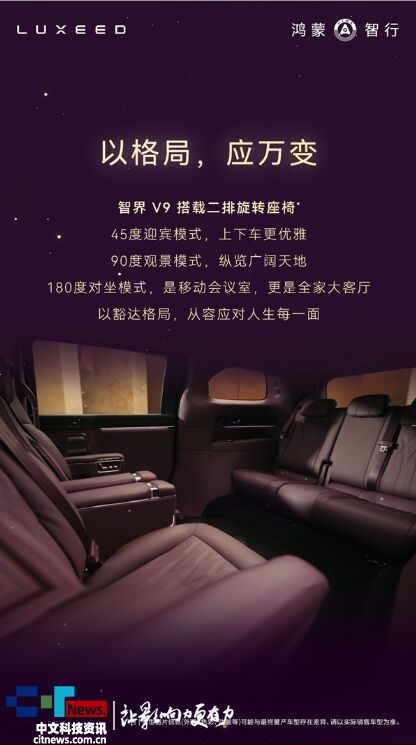 作为鸿蒙智行家族首款MPV,智界V9的官图此前已经公布,智界汽车今日又公布了该车的座舱官图。