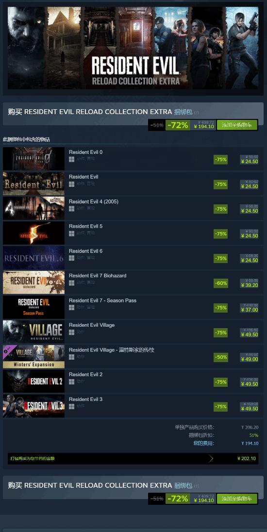 其中,收录了《生化危机》系列从0代至8代共9款正统作品(不含《生化危机4:重制版》)的《生化危机:重装上阵额外合集》也开启了限时特卖,活动期间打包带走仅需不到200元。感兴趣的玩家千万不要错过。