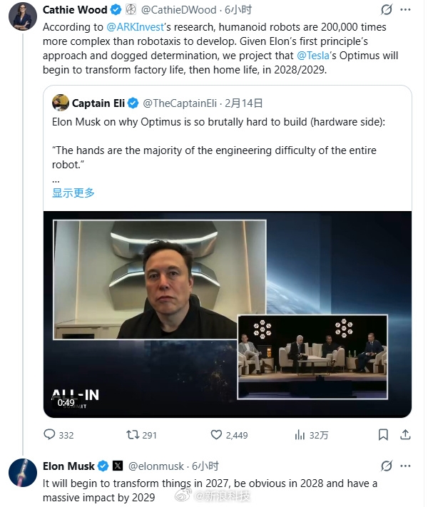 快科技2月15日消息,近日,方舟基金创始人“木头姐”Cathie Wood在社交平台上发帖称:“根据ARKInvest的研究,开发人形机器人要比开发机器人出租车复杂20万倍。鉴于埃隆马斯克秉持的第一原则和坚定决心,我们预测特斯拉的擎天柱机器人将在2028/2029年开始改变工厂生活,进而改变家庭生活。”